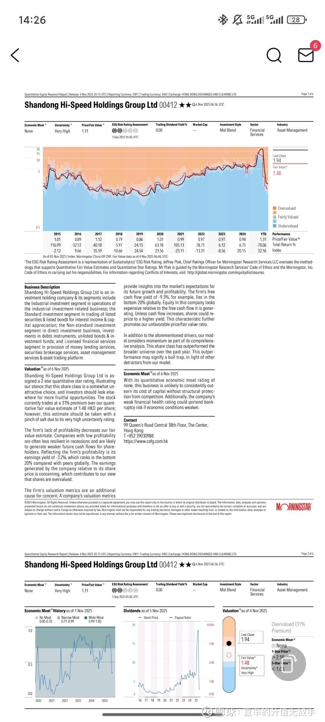 首先翻译一下美国晨星研报的核心内容:山东高速控股集团有限公司是一家投资控股 公司,其业务板块包括工业投资板块(负责工业投资相关业务的运营)、标准投资板块 (从事上市证券及债券的交易,以获取利息 收入和资本增值)、非标准投资板块(涉及 直接投资业务、债务工具投资、未上市债券 及投资基金)以及许可金融服务板块(提供 贷款服务、证券经纪服务、资产管理服务及 资产交易平台)。