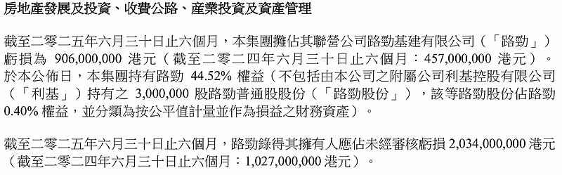 房地产方面的子公司是$路劲(01098)$ ,惠记持有路劲44.9%的股份,按照联营公司权益计入资产负债表,连年减值后按最新的25年中报算还剩下3亿,这部分房地产业务也是对惠记股价的最主要拖累因素。在惨烈的房价下行周期中经过多年挣扎,路劲最近刚刚官宣债务违约暴雷,谨慎一点考虑的话这部分资产可以按照归零来算。不过路劲持有的印尼高速公路等较优质资产按照账面价值算应该是能覆盖债务的,只是流动性较差无法短时间变现才导致的债务违约,所以路劲暴雷后仍有5亿港元市值。考虑到港股有的是更加资不抵债的地产公司债务违约多年后仍然能在几亿市值徘徊,乐观一点估计的话房地产业务还是能值个一到两亿的。