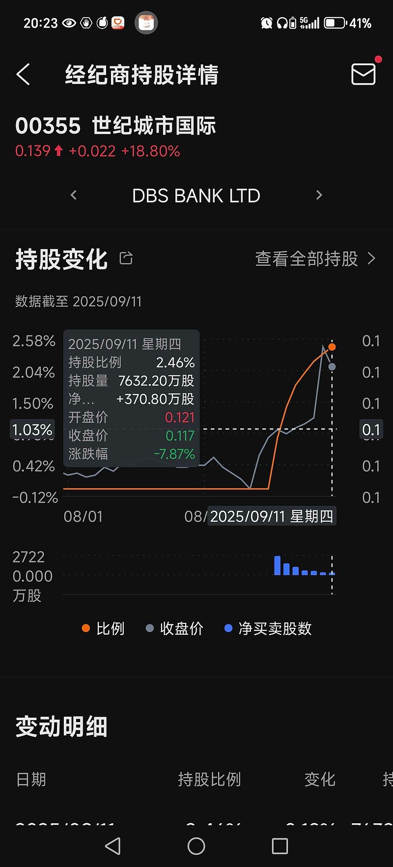 $世纪城市国际(00355)$ 暴涨的主要原因就是星展银行的席位在两周内很坚定地大额买进了2.5%的股份,以355之前日均几十万的成交额,这种买法暴涨是必然的。粗略估计该席位两周内砸进去至少六百万,而且直到今天还在持续买入。