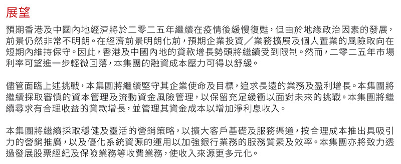 大众银行从2023年起遇到的困难在2023年和2024年的财报里公司自己已经总结得非常清楚了:一是因为香港的宏观经济下行影响到了传统的租购贷款业务,导致计提的信用损失准备增加,二是美联储大幅加息导致吸收存款的成本快速上升净利息收入减少。另外实控人郑鸿标老先生于2023年去世,估计对公司业务也有影响。好在这几个因素随着美联储降息和香港房价触底反弹,都已经看到了反转的曙光,而这也是公司能在2025年中报恢复分红且展望乐观的底气所在。