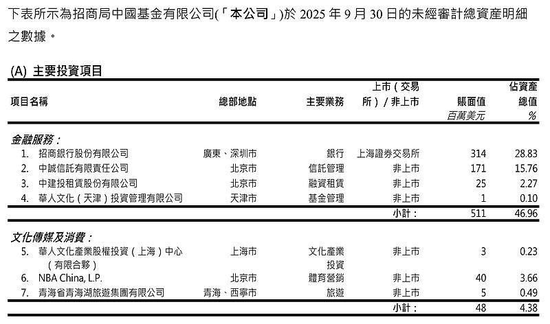 说回招商局中国基金,这也是个市值相对公司资产明显折价的典型,雪球上不少大佬都有过分析,我就不班门弄斧再详细解读了。总结一下就是公司持有的各类优质上市/非上市公司股权,既包括招商银行、中诚信托、中国银联、NBA中国、中建投租赁 这些现金奶牛,又有科大讯飞、影石创新、讯飞医疗、小马智行、月之暗面、非夕科技 这些科技新贵。基金公布的今年9月最新持仓我也贴在下面了,从净资产的角度来看折价率38%。