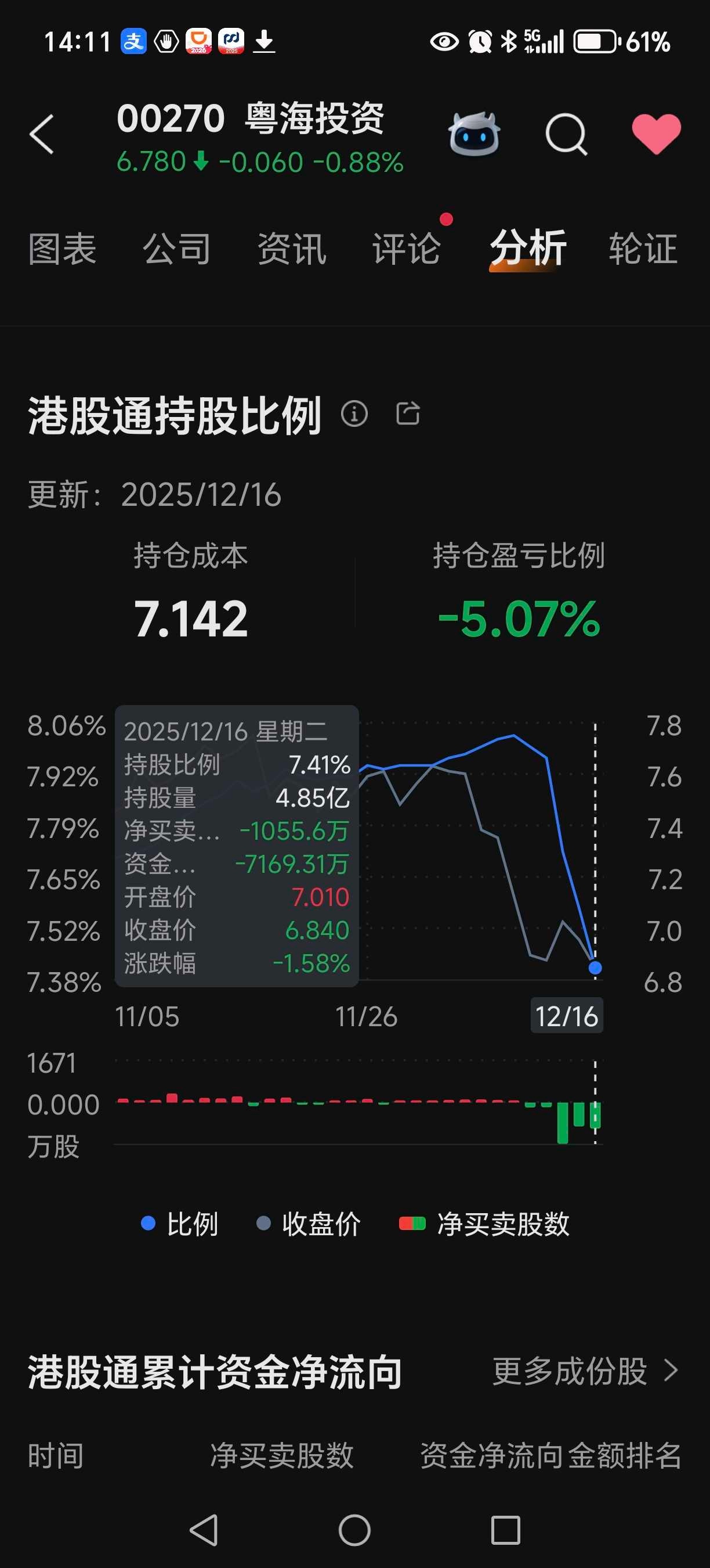 我们再来对比一下同样被港股通高股息指数剔除的$粤海投资(00270)$ ,它在调整前占比3.13%,本身成交量也更大一些,所以受到的影响比$兖煤澳大利亚(03668)$ 略小。