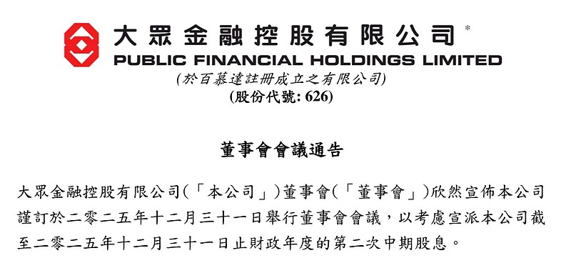 $大众金融控股(00626)$ 最新公告,将于12月31号召开董事会宣布股息分派。年底公布派息这个也符合公司以往有分红时的惯例,加上已经宣布的0.02港币中期股息,24年中断了一年的分红已经确定回归,得益于美国降息、香港房地产市场企稳、港股市场火热三重利好,公司业绩正在不断改善中!如果能回到2022年的水平,相比现价就是12%的股息率。大众银行虽然规模比不上头部大行,但也有七十多家线下网点管理着四百多亿资产,市值却只有15亿,实在是过分低估了