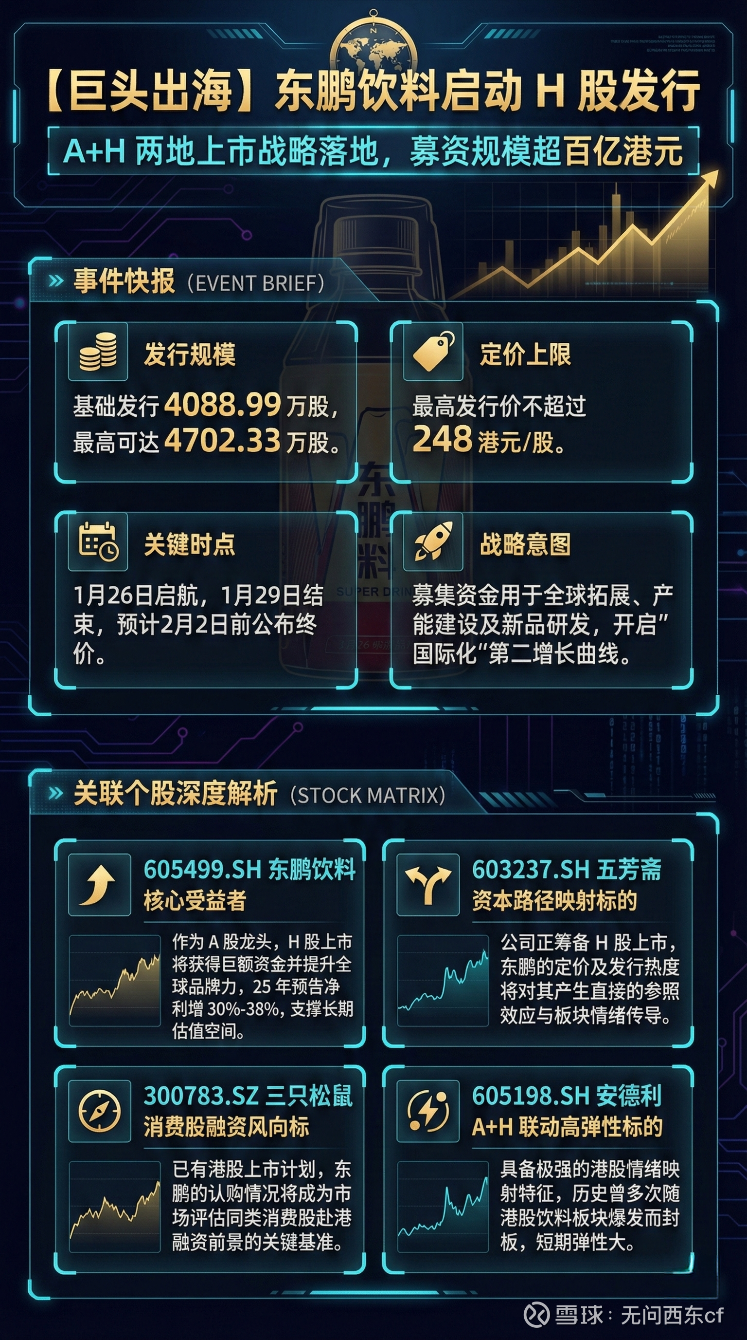 1月26日,东鹏饮料正式开启H股招股,最高定价248港元,募资规模直指百亿。这不仅是东鹏国际化的里程碑,更是2026年大消费板块的一场“深水炸弹”。当A股的“功能饮料之王”遇上港股的估值体系,这场A+H的资本游戏里,谁是真正的受益者?三只松鼠、五芳斋们又在看什么?