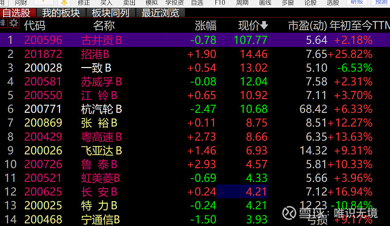 深B按股价排名的前12名,和股息率排名,市盈率排名高度一致了。唯一的例外是杭汽轮B,不过这玩意马上要去A,不来捣乱了。