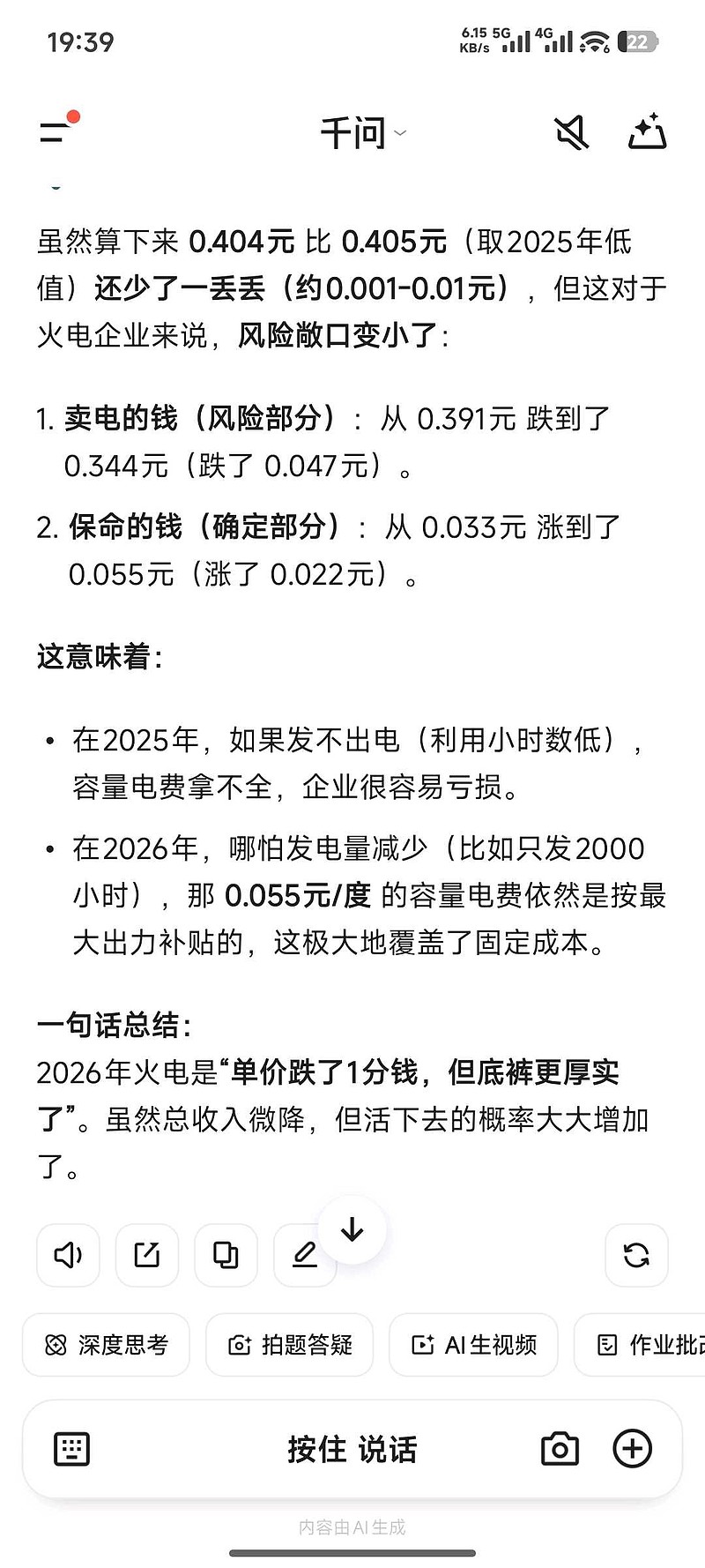问了一下千问,它估算江苏火电2025年是平均0.38电价+0.03容量=0.41,2026年是0.344电价+0.055容量+0.005系统运行费=0.404,实际只降了一丢丢。请问这个算法靠谱吗 @莫南 @爱投资的小人书 @剑王子123 $江苏国信(SZ002608)$ $华能国际(SH600011)$