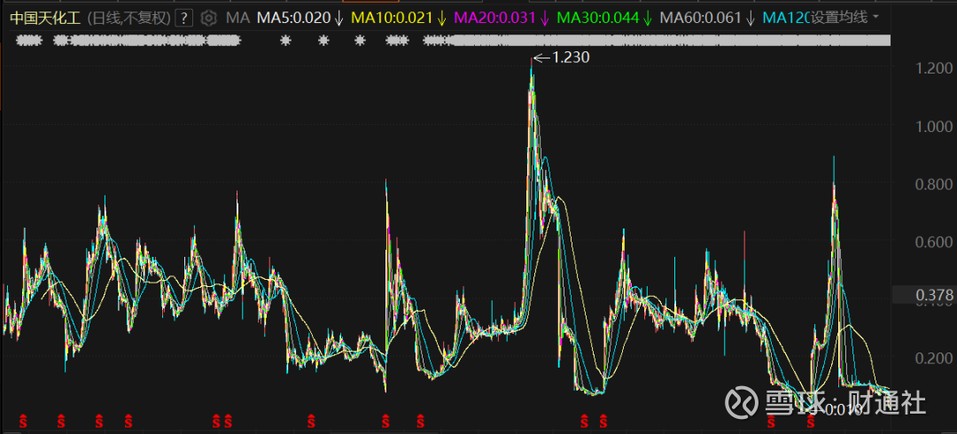尽管公司频繁更名,但显然只是为了挽救股价的无奈之举。自上市以来,中国天化工股价来回震荡,在2015年一度达到历史高点1.23港元/股,之后一路狂泄。2022-2023年间,中国天化工出现了一波强势反弹,差点摸到1港元/股,随后再度下挫,如今股价几近归零,较最高点缩水近99%。