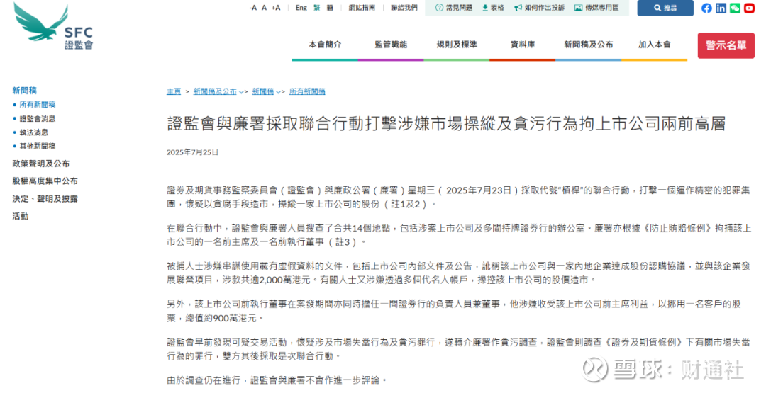7月25日,香港证监会官网发布消息称,该会与廉政公署在7月23日采取代号“杠杆”的联合行动,打击一个运作精密的犯罪集团,怀疑其以贪腐手段造市,操纵一家上市公司的股份。
