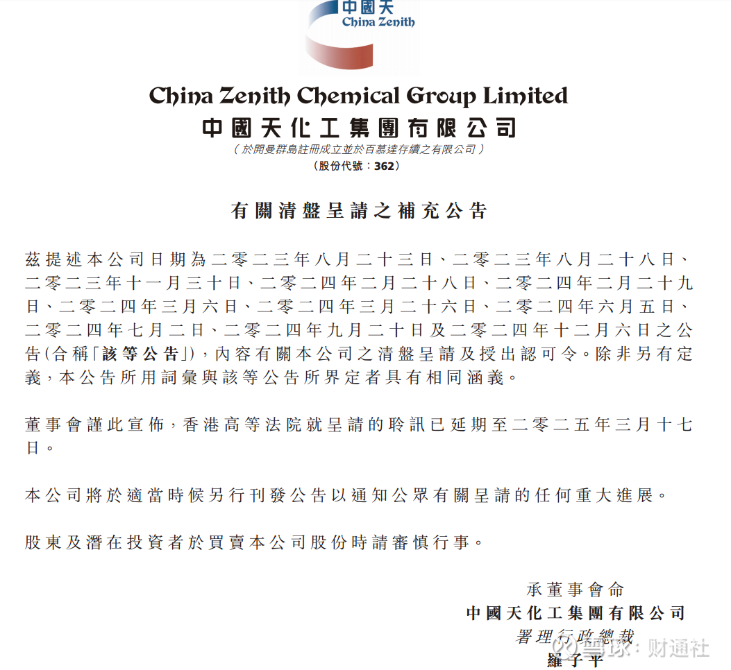 今年3月14日,中国天化工发布《有关清盘呈请之补充公告》称,香港高等法院就呈请的聆讯已延期至2025年3月17日。