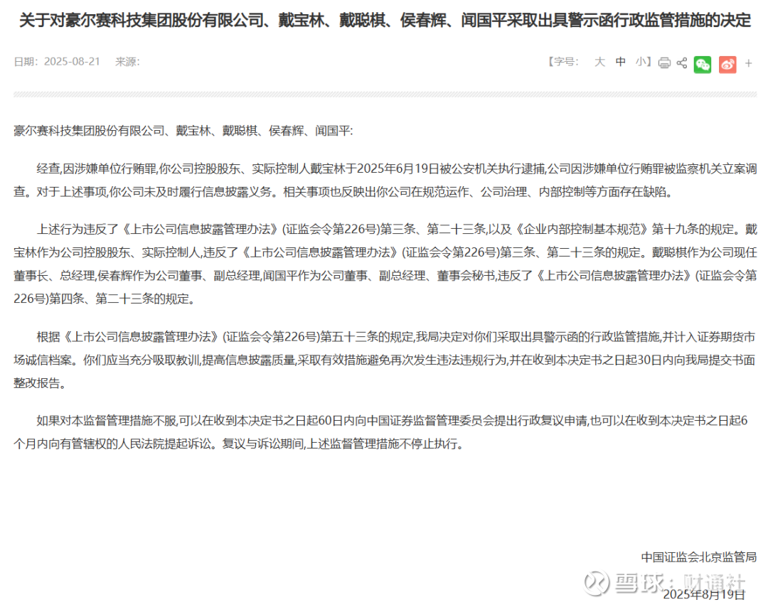 8月19日,北京证监局向公司及相关责任人出具警示函,认定豪尔赛未就关键事项及时披露,“在规范运作、公司治理、内部控制等方面存在缺陷”。