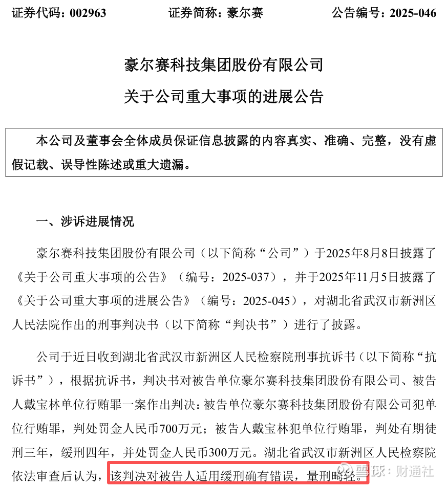11月5日,公司披露武汉市新洲区人民法院对相关单位行贿案作出的一审判决:豪尔赛被罚700万元;戴宝林被判三年有期徒刑、四年缓刑及被罚300万元;此前扣押的约2151.61万元企业违法所得被追缴。