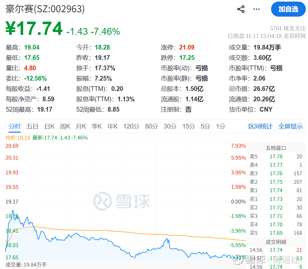 截至今天下午A股收盘,豪尔赛股价报17.74元/股,下跌7.46%,总市值26.67亿元。