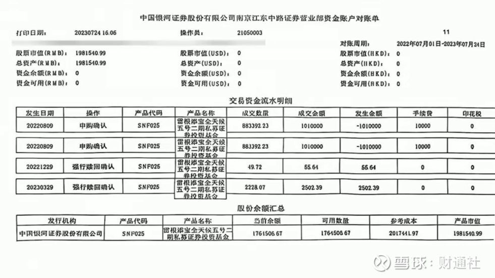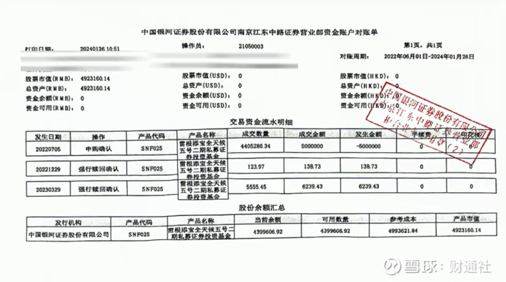 2022年8月,黄先生通过银河证券APP支付1005万元(包括5万元佣金),购买雷根添宝五号份额约883.81万份。