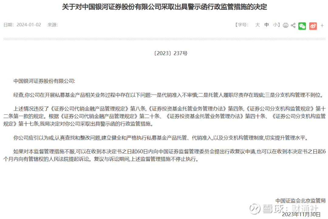 2023年11月,北京证监局向银河证券出具警示函,指其在开展私募基金产品相关业务过程中存在代销准入不审慎、托管人履职尽责存在瑕疵、分支机构管理不到位的问题。