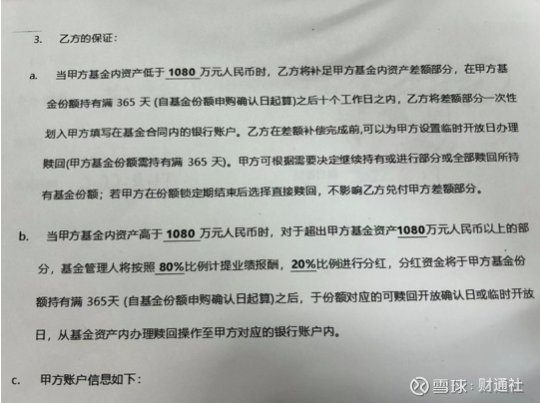 该协议约定其持有基金份额满一年后可获得至少1080万元,明显构成保本保收益承诺。