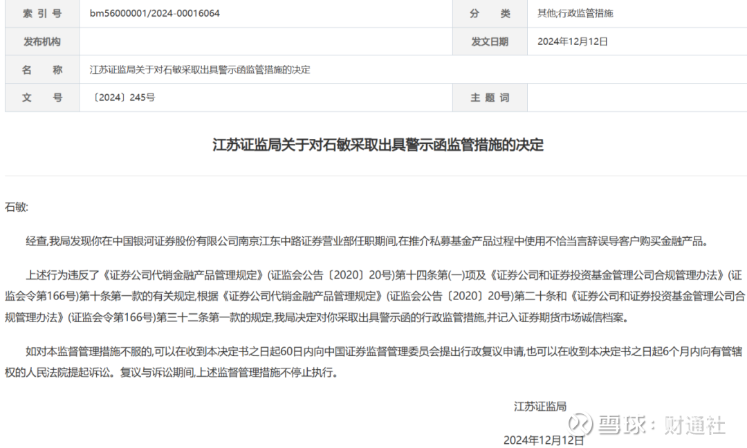 江苏证监局发现石敏任职银河证券南京江东中路证券营业部期间,在推介私募基金产品过程中使用不恰当言辞误导客户购买金融产品。