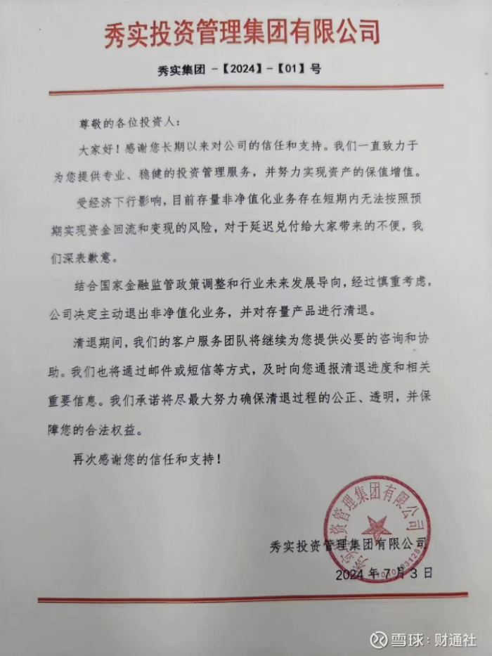 界面新闻披露,早在2024年7月3日,秀实集团已在内部发布延迟兑付公告,称将“主动退出非净值化业务,并对存量产品进行清退”。