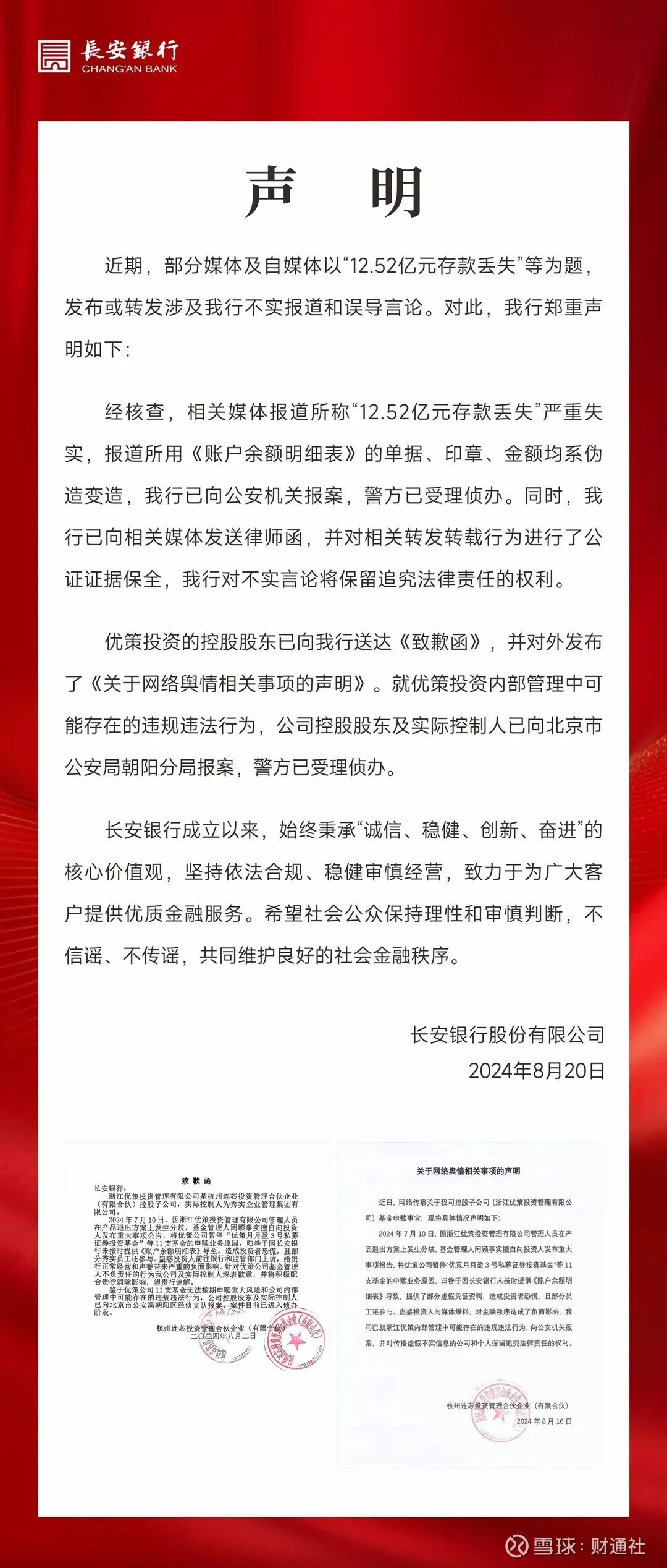 2024年8月20日,长安银行发布官方声明,称此前媒体报道失实,优策投资控股股东已向其致歉。