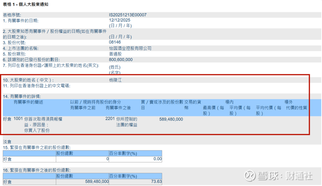 12月10日,杨陵江通过Hill Valley Investment Co Ltd收购了怡园酒业73.63%的股份,成为其最大单一股东。