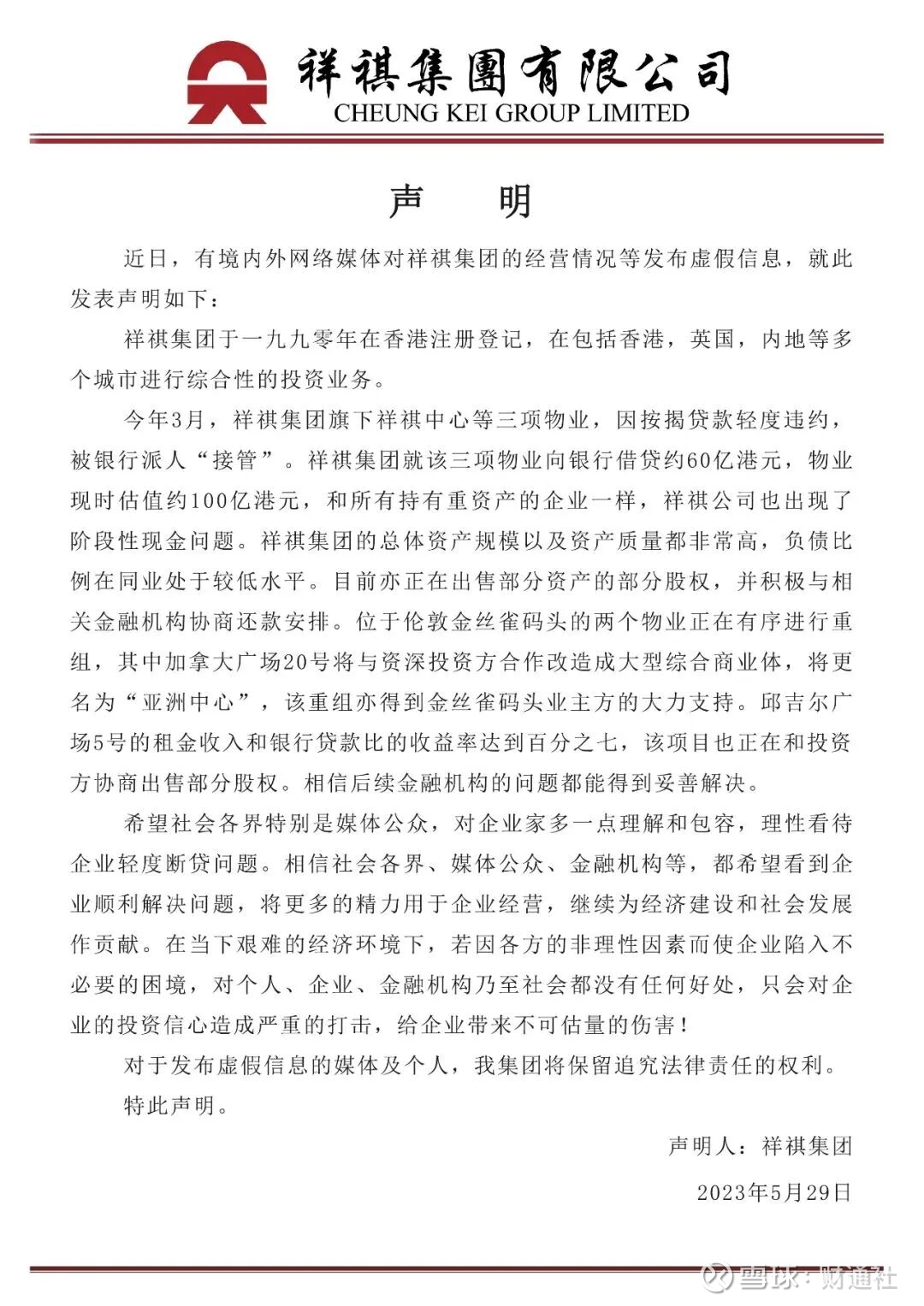 祥祺集团在2023年5月的一份声明中承认,公司面临“阶段性现金问题”,原因包括多笔大额应收账款被临时悔约,以及内地业务推进受阻。