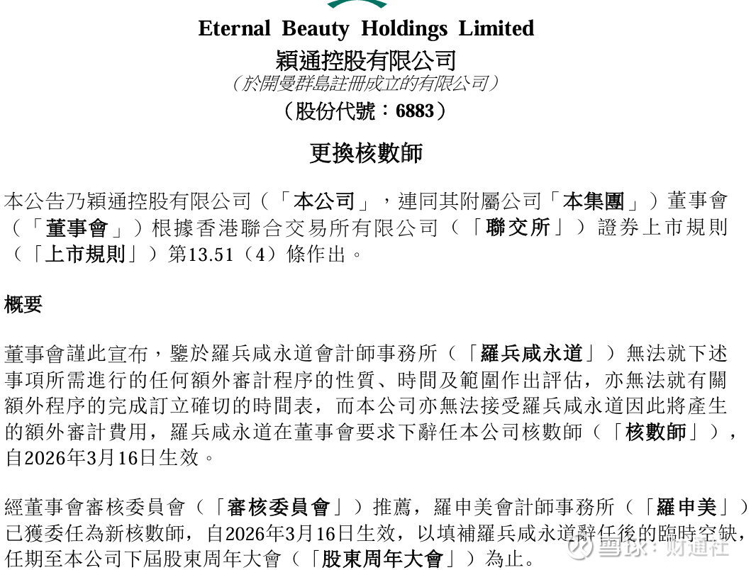 值得注意的是,颖通控股强调,截至3月16日罗兵咸永道尚未开展2026财年的审计工作,因此更换核数师不会影响年度业绩披露节奏。