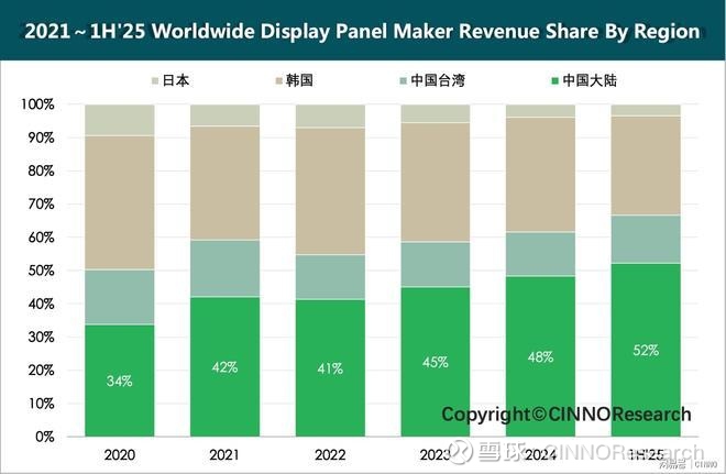 图示: 2020~1H’25全球显示面板分区域营收份额变化,来源: CINNO Research