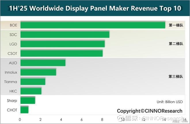 图示: 2025上半年全球显示面板企业营收TOP10排名,来源: CINNO Research