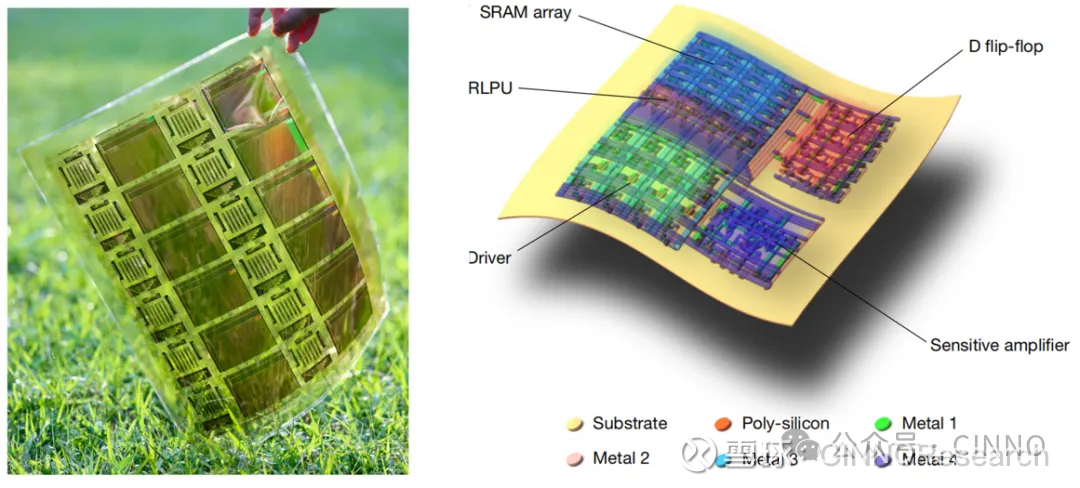 全国产工艺制造:FLEXI芯片基于维信诺自主的CMOS LTPS 面板工艺制造,成功打通了适用于存算芯片设计的特殊工艺路线,证明了采用面板工艺制备高性能柔性集成电路的可行性,为柔性电子奠定了坚实的工艺基础。