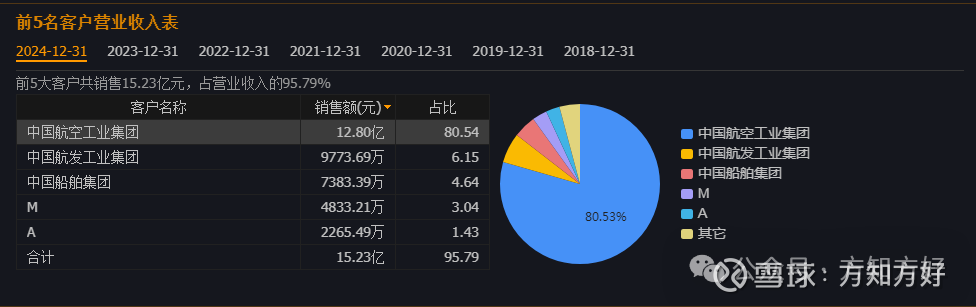 从2024年公司前五大客户名单可以看见,仅中国航空工业集团营收占比就高达80%;