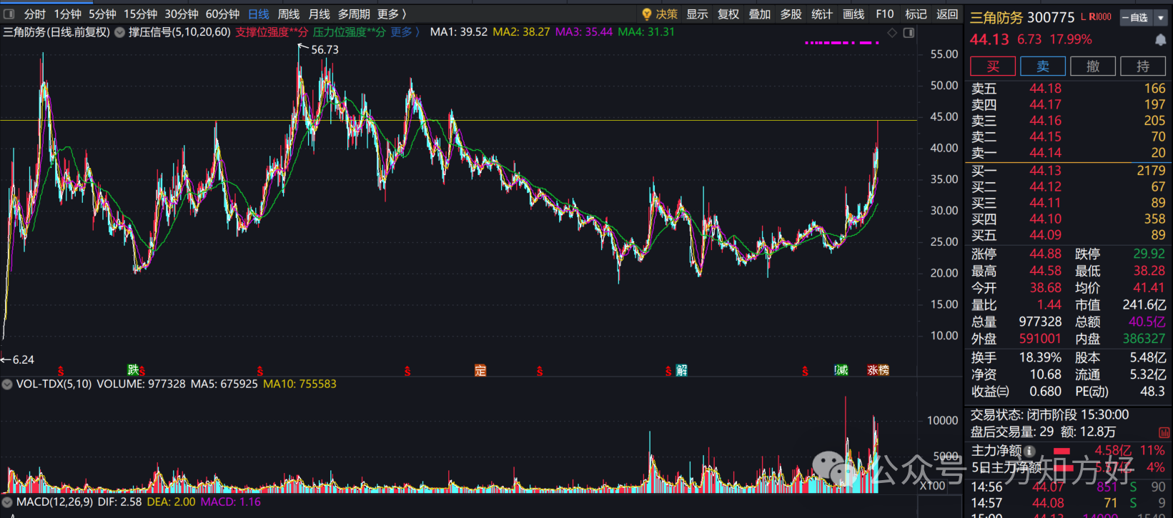 三角防务基本面扎实,且有题材加持,比市面上很多炒作的公司拿着让人更安心,只要有热点炒作,很容易就出现20CM涨幅。