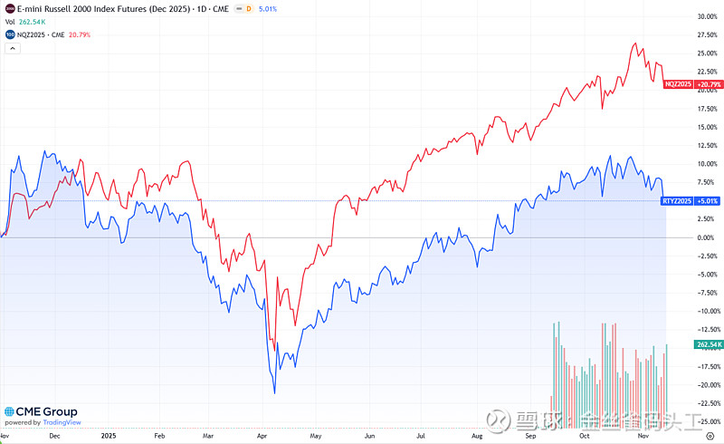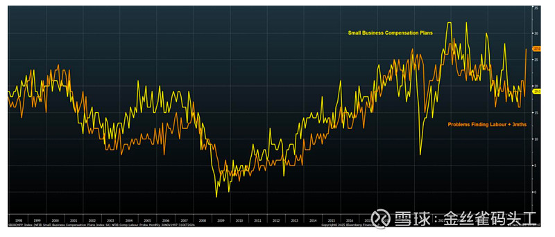 就像上篇文章我们讨论的美国消费与居民收入K型分化一样,美国企业部门其实也一样呈现出明显的“K 型结构”。大企业尤其是纳指权重的科技巨头依旧利润爆棚,而另一边,中小企业的经营和财务状况却越来越吃紧。考虑到美国有超过 6000 万人受雇于这些中小企业,占整个私人部门就业的七成以上,它们的景气程度基本决定了美国的就业情况。