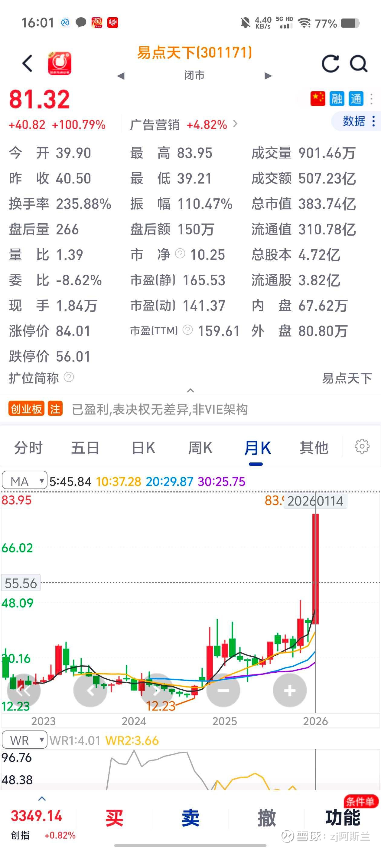 开年短短八个交易日,$易点天下(SZ301171)$ 刚刚好翻倍. 这是我做梦也不曾梦到的。从24年11月5日第一次买进,短线进进出出,到24年末开始长期慢慢加仓,至今持有它已四百个日夜了,期间它曾是我的第一重仓股,也曾是我满仓单吊还加了融资的票,最多时拿过400手,因为坚定看多,因为持有它的账户近三年一直满仓满融,所以只敢在暴跌时卖了别的票去做个正T,这一年多它剧烈的波动让我总是在天上地下来回滴跑,这其中的苦辣酸甜真不是用语言可以描述的。