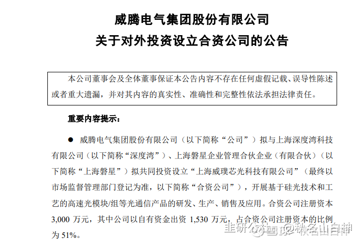 威腾电气集团股份有限公司(以下简称“公司”)拟与上海深度湾科技 有限公司(以下简称“深度湾”)、上海磐星企业管理合伙企业(有限合伙)(以 下简称“上海磐星”)拟共同投资设立“上海威璞芯光科技有限公司”(最终以 市场监督管理部门登记为准,以下简称“合资公司”),开展基于硅光技术和工 艺的高速光模块/组等光通信产品的研发、生产、销售及应用。合资公司注册资本 3,000 万元,其中公司以自有资金出资 1,530 万元,占合资公司注册资本的比例 为 51%。