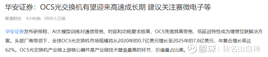华安证券发布研报称,AI大模型训练对通信带宽、时延和功耗要求极高,OCS凭借其高带宽、低延迟特性成为理想互联解决方案。头部厂商带领下,全球OCS光交换机市场规模将从2020年的0.7亿美元增长至2025年的7.8亿美元,年复合增长率达62%。OCS光交换机产业链上游核心器件是产业链技术壁垒最高的环节,价值量占比高。