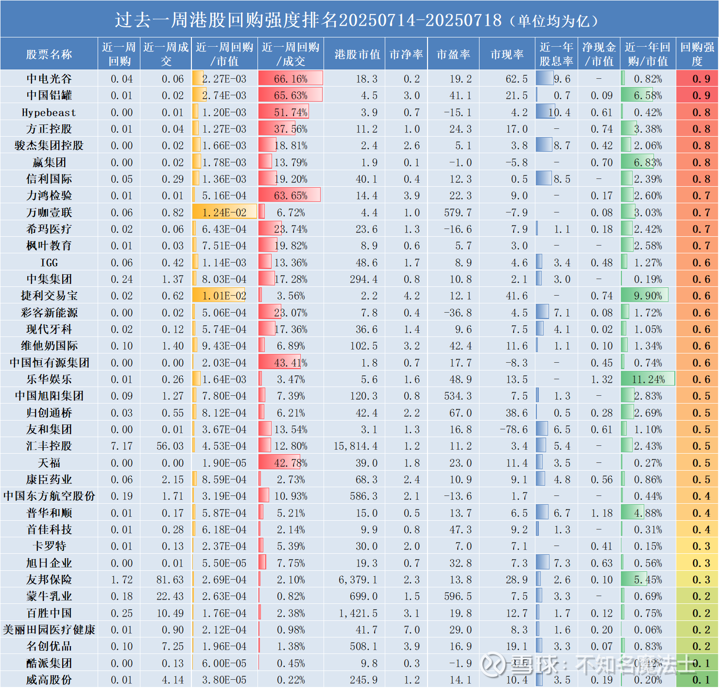 以下是过去一周(20250714-20250718)港股回购强度排名: