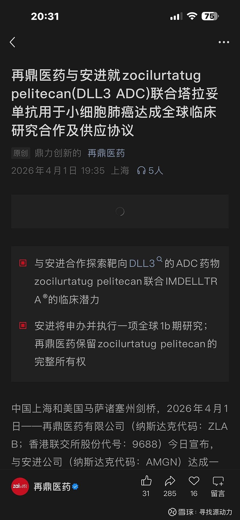 号外,号外,安进选择将自家的已上市核心产品与Zoci联合开发,DLL3赛道正在快速升温。2024年1月默沙东收购Harpoon,获得DLL3三抗;2024年12月恒瑞将DLL3 ADC海外权益授权给IDEAYA(首付7500万美元,总额超10亿);2025年1月信达将DLL3 ADC授权给罗氏(首付8000万美元,总额约10亿)......在竞品纷纷通过"授权出海"变现的背景下,再鼎今日官宣内容可以看见的策略是:不卖权益,而是与巨头联合开发,保留完整所有权。这既获得了安进的临床开发资源支持,又没有让渡未来价值。同时,与已上市的塔拉妥单抗联合,可以更快进入临床、更快占领医生心智。$再鼎医药(09688)$ $再鼎医药(ZLAB)$