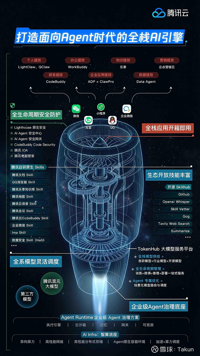 腾讯的养虾产品全景图$腾讯控股(00700)$腾讯集团高级执行副总裁、云与智慧产业事业群CEO汤道生表示:「当前,人工智能的应用范式正从"Chatbot"向"AI Agent"跃迁。AI落地不只是一道算法题,更是一道工程题——随着主流大模型能力差距逐步缩小,企业比拼的不再是"谁的模型更强",而是谁能通过工程化手段把模型用好。未来,每一个个体、每一家企业都能借助标准化工具,快速搭建专属智能体应用,共同构筑一个去中心化、高度繁荣的Agent生态。」