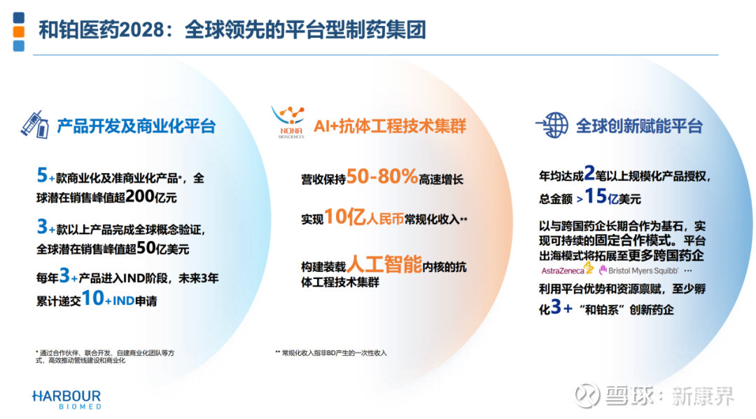 但是,往前看的话,和铂自身仍然保持着信心,根据和铂于12月17日披露的PPT来看,和铂提到了2025-2028年是和铂跨越式发展的阶段,在2028年,它的目标是成为全球领先的平台型商业化制药集团,到时候将会有5款以上商业化及准商业化产品。全球潜在销售峰值超200亿元。并且,由于AI+抗体工程技术赋能,它也将实现10亿人民币的常规化营收。而更重要的是,它有着年均达成两笔BD的野心,总金额要超过15亿美元。