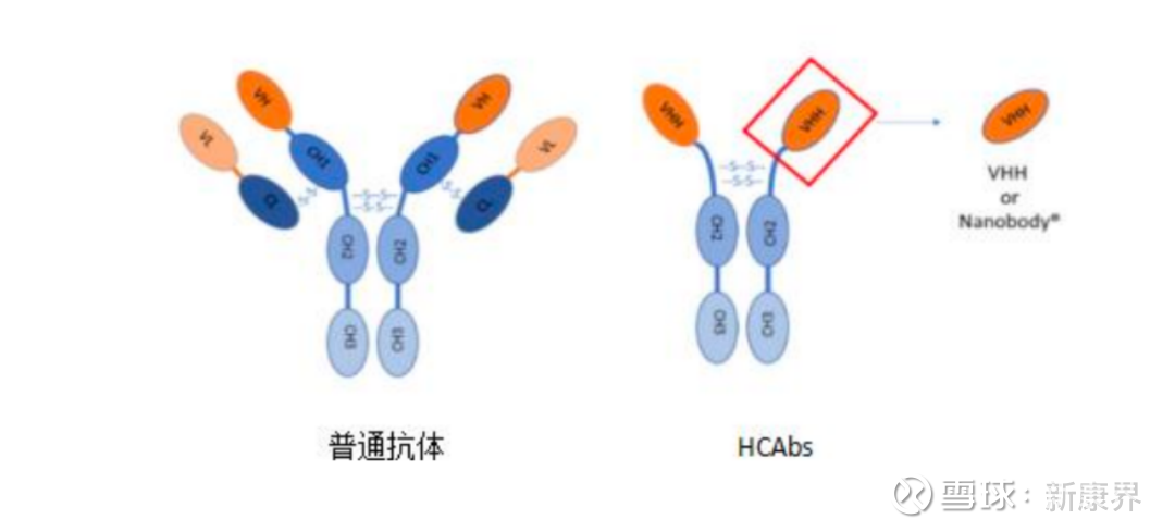 这里我们重点要提到和铂的HCAb Harbour Mice平台,它目前最大的特点是可以生成仅重链抗体(HCAb),1993年,比利时布鲁塞尔自由大学免疫学家Hamers-Casterman 教授以及他的同事们在骆驼的血清中发现了有别于传统抗体的新型抗体,其仅由两条重链构成,因此被称为重链抗体(Heavy-Chain Antibody, HCAb)。重链抗体的可变区片段可以单独克隆并表达出来,且具有与原重链抗体相当的结构稳定性以及抗原结合活性,其分子量约为 15kDa,只有常规抗体的十分之一大小,因此也被称作纳米抗体(Nanobody)。下图为普通抗体和HCAb的结构区别示意图。