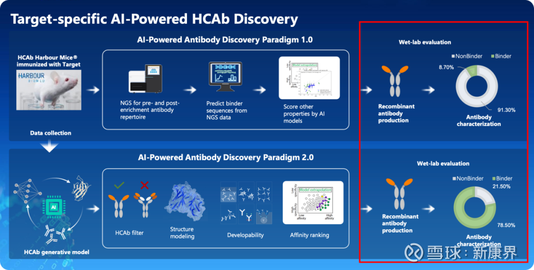 当然,AI模型是要随着数据的投喂而慢慢完善的,但是为了可以看到的是,随着AI模型被投喂的数据集越来越多,质量越来越高,未来能够替代的湿试验也会越来越多,并且我们可以看到下图当中,AI抗体发现平台从1.0到2.0的迭代之后,筛选出的抗体质量得到了非常大的提升。1.0的模型筛选出的抗体中,湿实验评估后,其中的binder(有亲和受体的抗体)仅为8.7%,而在2.0中,这个数字大幅度提升到了78.5%,这意味着筛选出来的“有用”的,能够亲和受体的抗体数量得到了大幅度的提升。