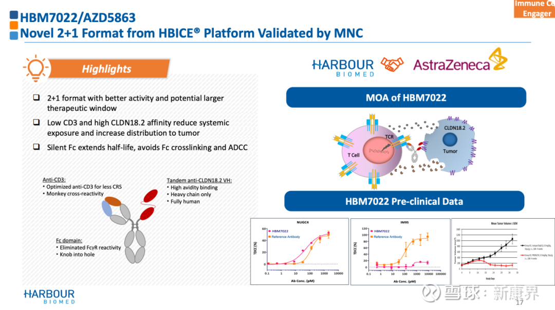 而之后就是与阿斯利康在2022年的BD了。2022年4月,和铂医药与阿斯利康达成授权合作,将HBM7022的全球开发与商业化权益(除大中华区外)授权给后者。该药是做的最早的CLDN18.2×CD3的TCE双抗之一,在当时首付款达到了2500万美元,交易总金额达到了3.5亿美元。该药的设计如下图所示,2+1的抗体的设计,低CD3亲和力,高CLDN18.2亲和力,可以提升在肿瘤中的分布,Fc段沉默。在临床前试验中表现出了非常不错的肿瘤抑制效果。