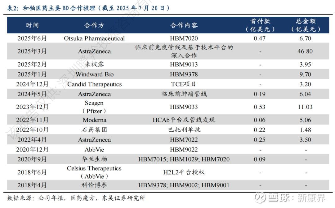 我们这里需要向大家澄清一个误区,其实和铂的BD并不是从今年才开始的,它很早就开始了它的BD历程,而这些BD,都绕不开和铂的技术平台,正是大家基于它的技术平台这只金鸡,才产出了诸多金蛋般的优质抗体。这里根据东吴医药的梳理,和铂自其成立以来已完成近60余项BD授权或技术合作。早在2018年,公司就和科伦博泰就三条管线开展了合作。