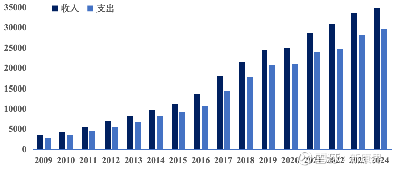 图3:2009-2024年我国基本医疗保险基金年度收支(单位:亿元)