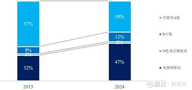 投资机构布局变化。2015-2024年,礼来亚洲基金、红杉中国、启明创投为投资次数前三机构。投资阶段从早期向中后期转移,早期至A轮融资占比从2015年57%降至2024年39%。