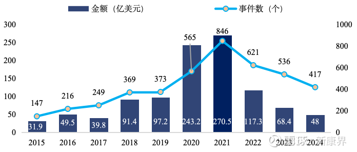 一级市场经历周期性调整。2021年融资规模达峰值270.5亿美元,2024年回落至48亿美元,资本更聚焦临床价值高的项目。融资地域集中,融资事件数TOP5城市集中在京津冀、长三角、粤港澳大湾区。