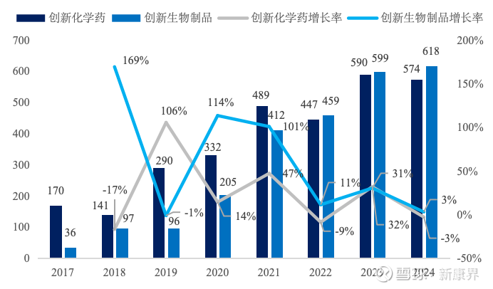 图1 2018-2024年中国上市的1类化药和生物药统计
