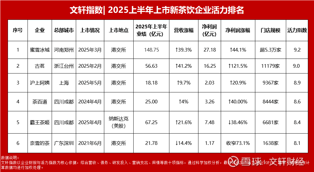基于此,文轩财经以企业财报与活力指数为核心依据,综合企业营收、债务、研发投入、营销支出、舆情等多项指标,最终加权分析得出2025上半年上市新茶饮企业活力排名。
