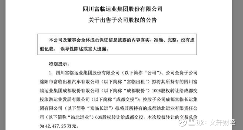 文轩财经了解到,11月14日晚间,富临运业披露一则拟出售子公司股权的公告。