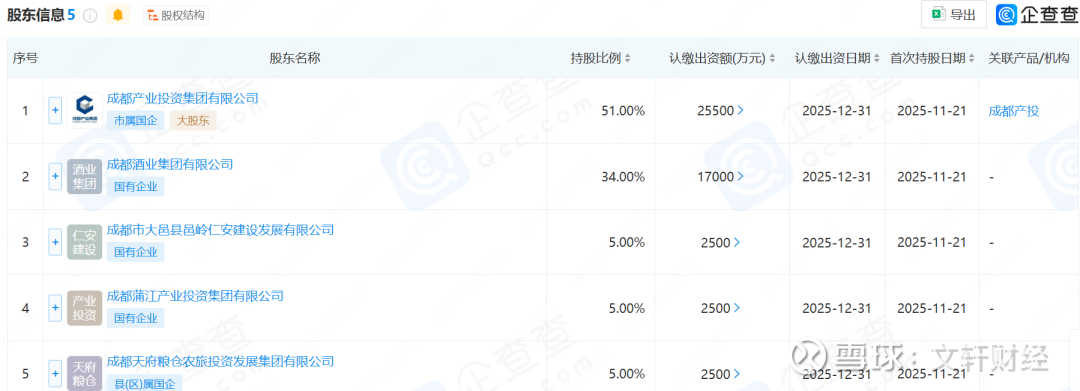 成都天府粮仓农旅投资发展集团有限公司认缴出资额2500万元,持股5%。