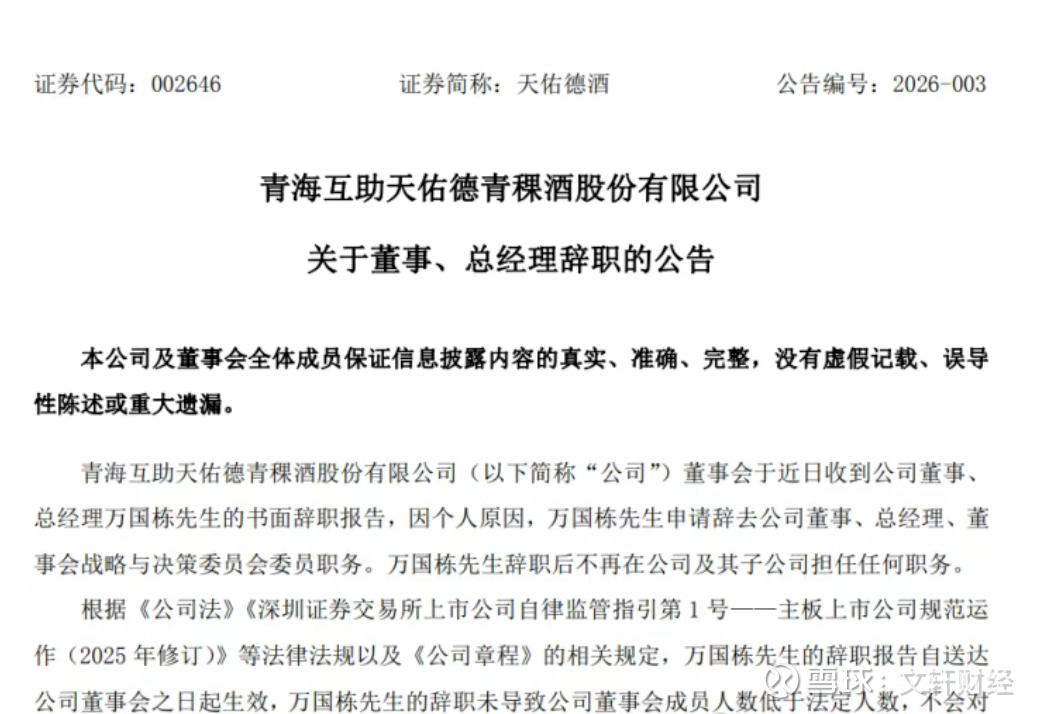 近日,青海互助天佑德青稞酒股份有限公司(简称“天佑德酒”)发布人事变动公告,公司董事、总经理万国栋因个人原因辞去所任全部职务。值得关注的是,距离其副手、副总经理鲁水龙的离职,仅过去一个月。